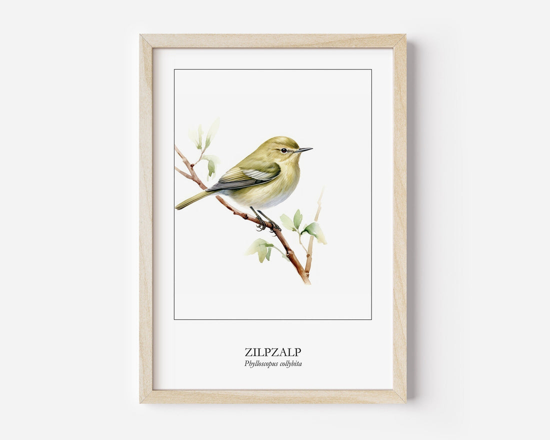 Zilpzalp Poster Watercolor Digitale Wandkunst Poster für Ornithologen Geschenk Umzug Aquarell Poster Zilpzalp auf Ast Vogelposter